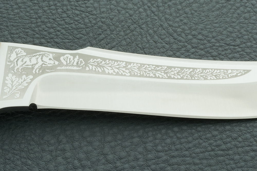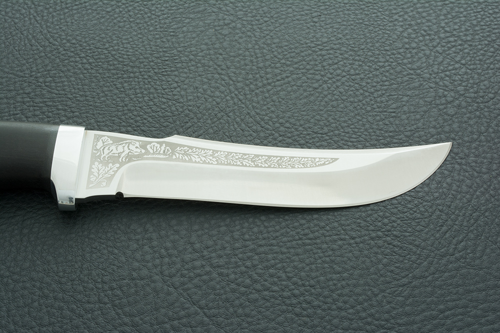 Нож подкупает покупателей своим хищным клинком, откуда и получил название «Клык». Орудие универсальное, в то же время крупное и прочное, выполненное в восточном стиле ятагана с вогнутыми спусками. Не смотря на свою тонкость, лезвие имеет отличные режущие качества, демонстрирующиеся при использовании. Благодаря прогнутому фальшлезвию на ? длины клинка с толщиной обуха в 3,7 мм., инструмент может быть использован в процессе рубки костной части и хрящей туши. Полноценная форма рукояти и имеющаяся гарда ножа подходит для любого размера ладони, почему и уверенно ложиться в нее и не соскальзывает. Так же есть отверстие под темляк, а не разборный монтаж придает инструменту особую прочность. Используется для многих видов работ, в том числе и в лесу.