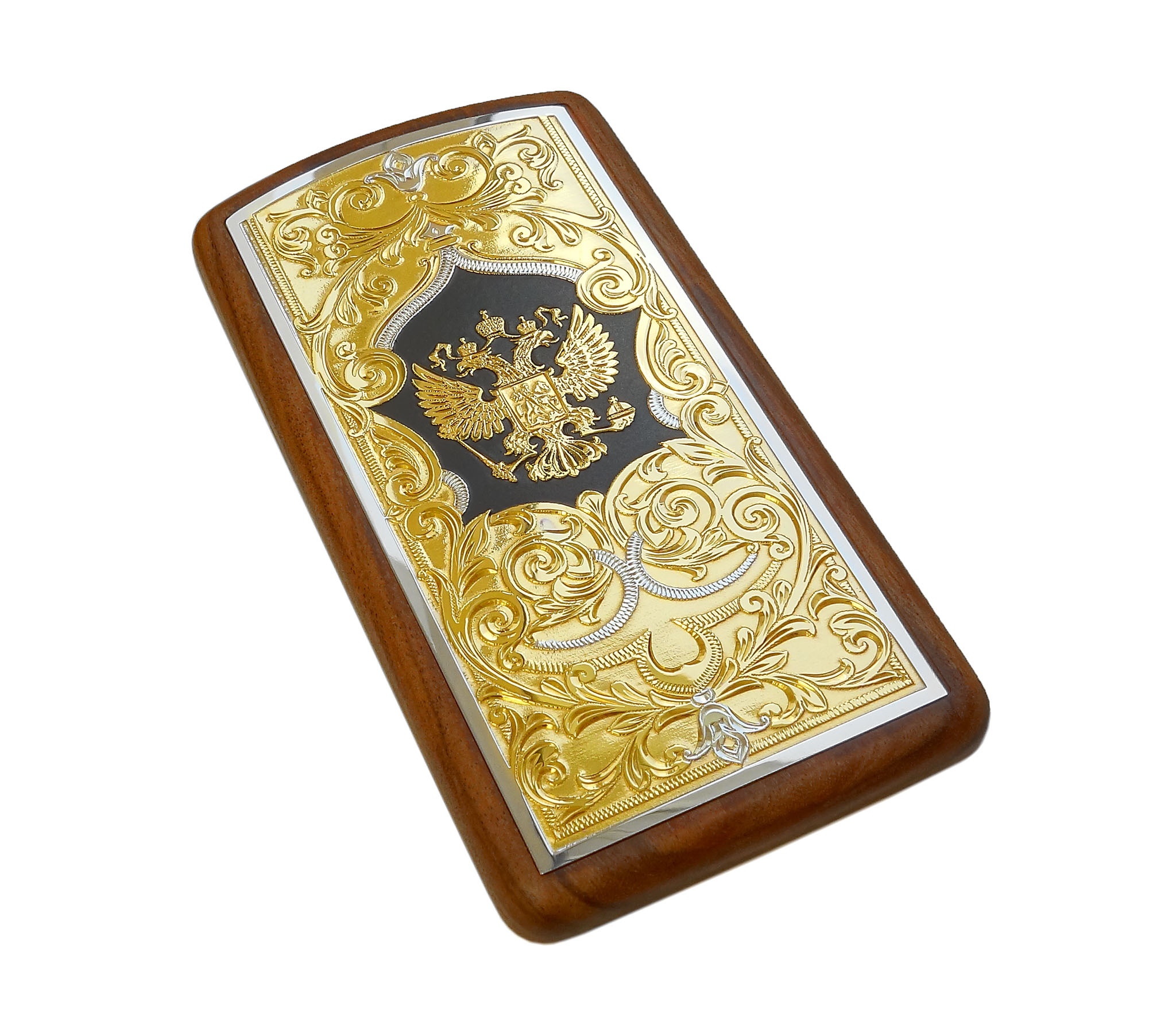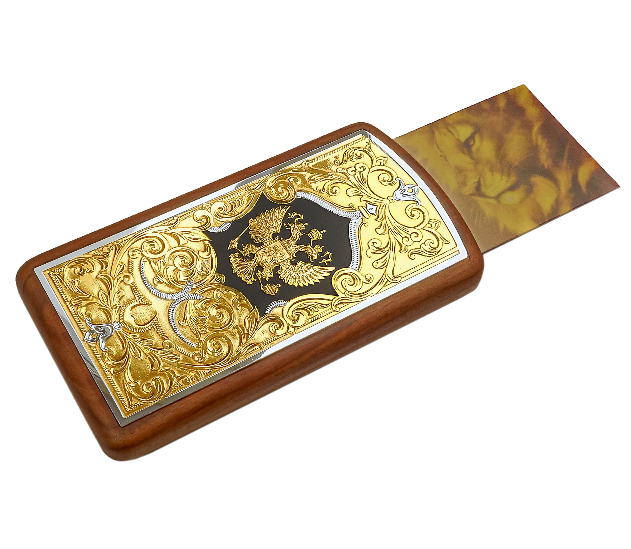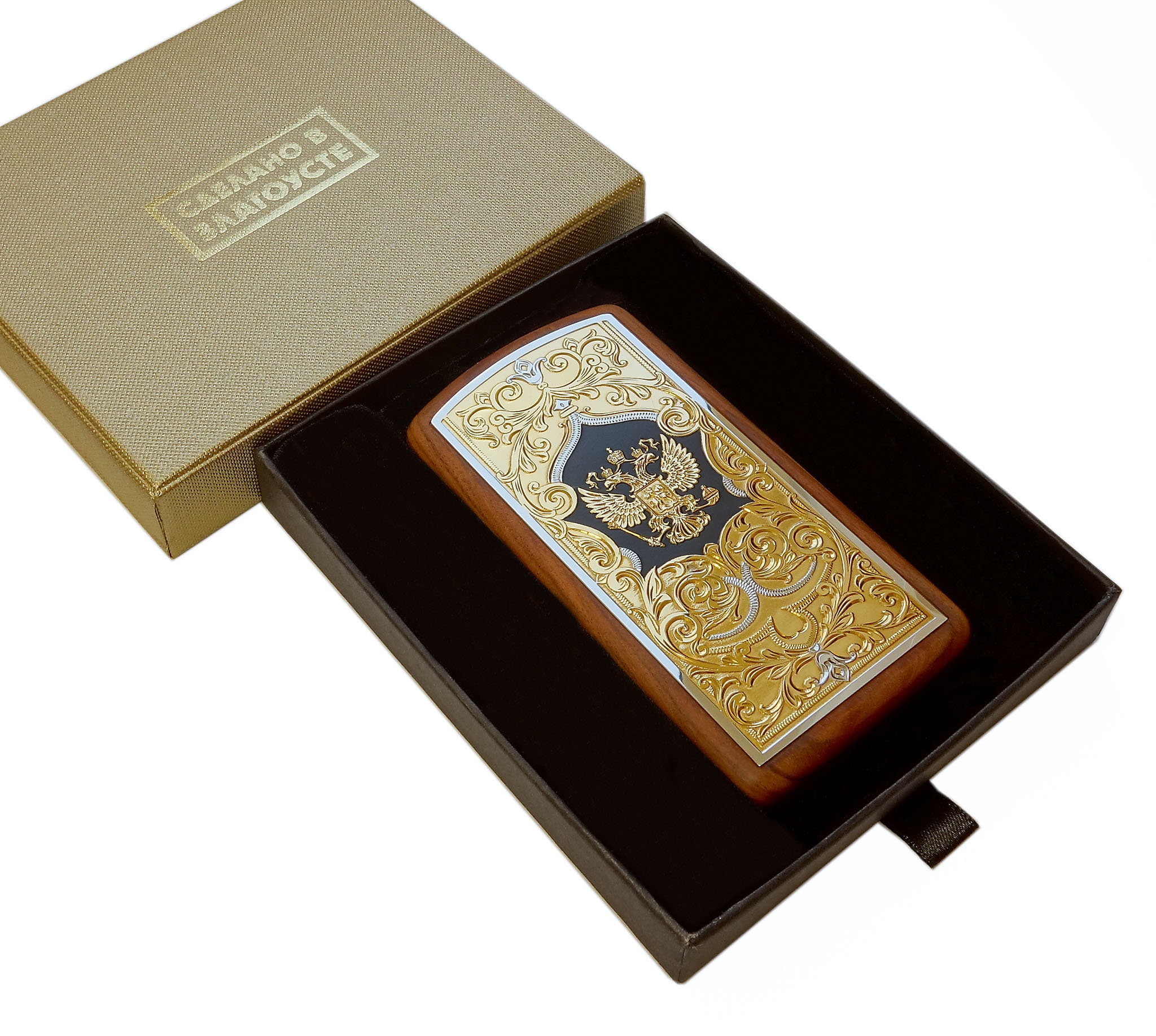 Эта визитница будет отличным и стильным аксессуаром, ведь она выполнена мастерами Златоуста по технологии гравюры на металле. Корпус визитницы выполнен из дерева с матовым покрытием, что придает ей еще больше утонченности и лаконичности. Эта визитница будет отличным подарком для себя или коллеги по работе. Визитница рассчитана на 14 визитных карточек. Размер, мм 109х59 Материал латунь, дерево Покрытие золото, никель, чернение Упаковка коробка фирменная